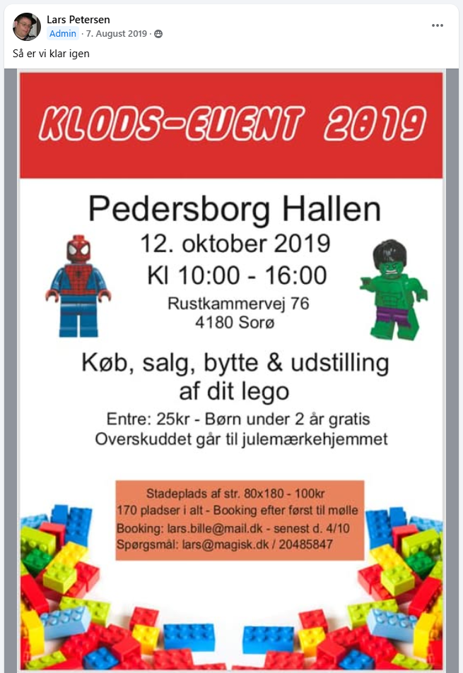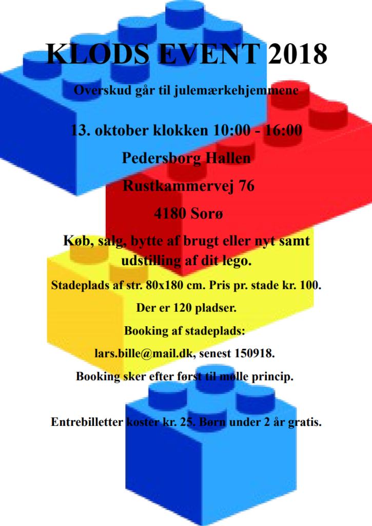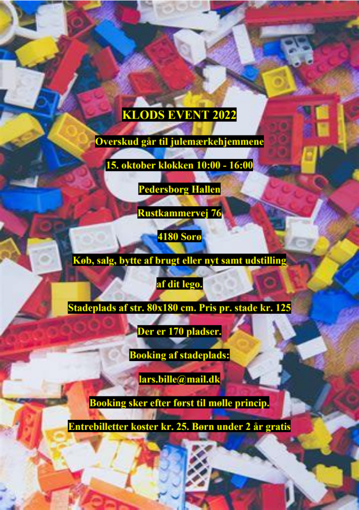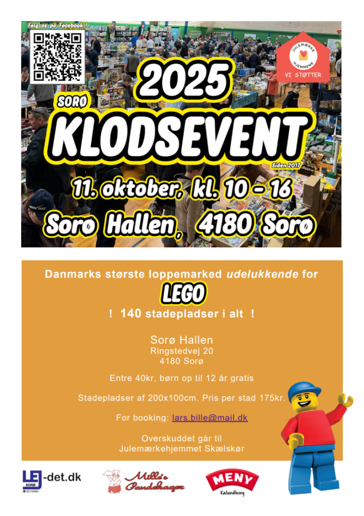 KLODSEVENT er Danmarks og formentlig enda Skandinaviens største (og i hvert fald mest klodsede) legetøjsloppemarked UDELUKKENDE for LEGO produkter. Du kan finde ofte stillede spørgsmål om KLODSEVENT på vores FAQ side og indtryk fra tidligere år i vores Galleri.